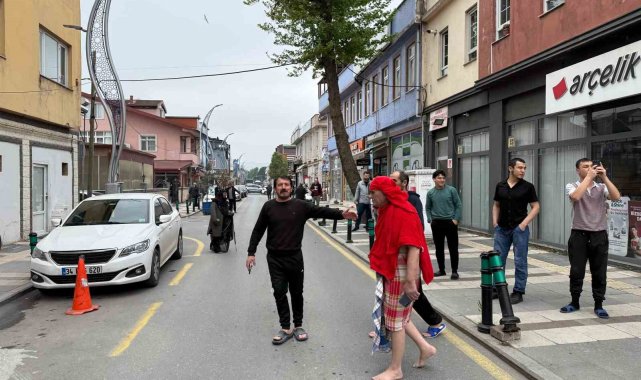 İstanbul'un Silivri açıklarında 6.2 büyüklüğünde meydana gelen ve Sakarya'da da hissedilen deprem sonrasında vatandaşlar sokağa döküldü. Deprem anında hamamda bulunan bir kişi peştamalla sokağa çıkarken, bir binada işçiler hiçbir şey olmamış gibi çalışmalarına devam etti.