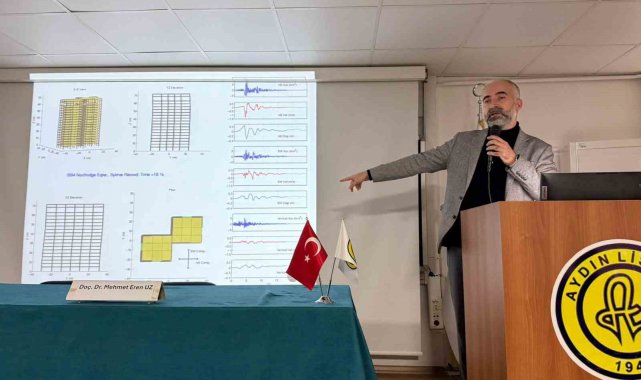 Türkiye'nin Deprem Gerçekleri başlığıyla Aydın Lisesi'nde gerçekleştirilen konferansta Aydın Adnan Menderes Üniversitesi İnşaat Mühendisliği Bölümü Yapı Ana Bilim Dalı Başkanlığından Doç. Dr. Mehmet Eren Uz Türkiye'nin aktif deprem kuşağında yer aldığına dikkat çekerek yapı güvenliği, mühendislik hizmetlerinin önemi ve afetlere karşı alınması gereken önlemler hakkında bilgilendirmelerde bulundu. Deprem gerçeğiyle bilinçli şekilde yaşamanın ve bilimsel veriler doğrultusunda hareket etmenin hayati önem taşıdığı vurgulandı.