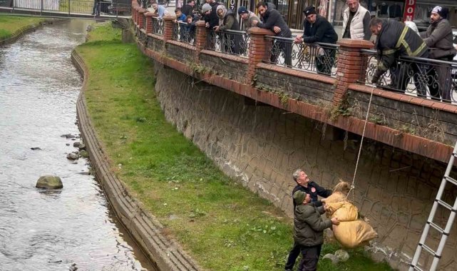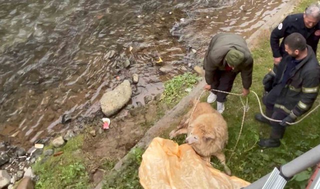 Olay, Ardeşen ilçesine bağlı Merkez Mahallesi'nden geçen Dolana Deresi'nde sabah saatlerinde meydana geldi. Edinilen bilgiye göre, dün geceden bu yana dere yatağında mahsur kaldığı tahmin edilen sokak köpeğini fark eden vatandaşlar, durumu itfaiye ekiplerine bildirdi. İhbar üzerine kısa sürede olay yerine gelen Kaçkar İtfaiyesi ekipleri, çevrede bulunan vatandaşların da desteğiyle kurtarma çalışması başlattı. Oldukça kilolu olan köpek, bez brandaya bağlanarak halat yardımıyla dere yatağından güvenli bir şekilde çıkarıldı.
