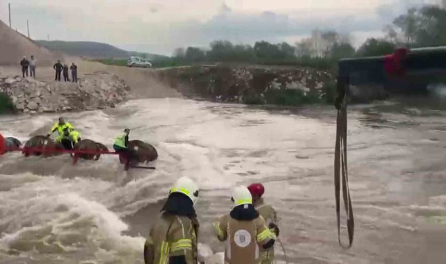 Bursa'da dereyi traktörle geçmek isteyen 10 işçi, aracın devrilmesiyle mahsur kaldı. İşçiler ekiplerin vinç destekli çalışmasıyla kurtarldı.