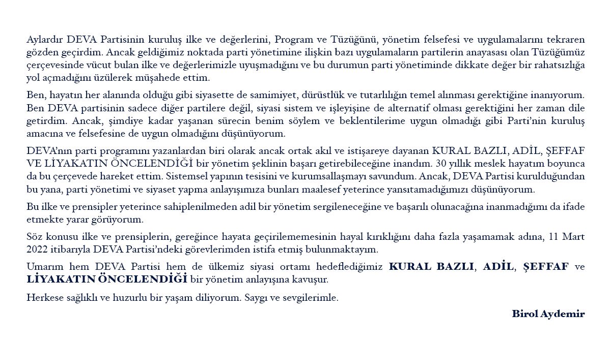 "Ancak, şimdiye kadar yaşanan sürecin benim söylem ve beklentilerime uygun olmadığı gibi Parti'nin kuruluş amacına ve felsefesine de uygun olmadığını düşünüyorum. DEVA'nın parti programını yazanlardan biri olarak ancak ortak akıl ve istişareye dayanan kural bazlı, adil, şeffaf ve liyakatin öncelendiği bir yönetim şeklinin başarı getirebileceğine inandım.""30 yıllık meslek hayatım boyunca da bu çerçevede hareket ettim. Sistemsel yapının tesisini ve kurumsallaşmayı savundum. Ancak, DEVA Partisi kurulduğundan bu yana, parti yönetimi ve siyaset yapma anlayışımıza bunları maalesef yeterince yansıtamadığımızı düşünüyorum. Bu ilke ve prensipler yeterince sahiplenilmeden adil bir yönetim sergileneceğine ve başarılı olunacağına inanmadığımı da ifade etmekte yarar görüyorum.""Söz konusu ilke ve prensiplerin, gereğince hayata geçirilememesinin hayal kırıklığını daha fazla yaşamamak adına, 11 Mart 2022 itibarıyla DEVA Partisi'ndeki görevlerimden istifa etmiş bulunmaktayım. Umarım hem DEVA Partisi hem de ülkemiz siyasi ortamı hedeflediğimiz kural bazlı, adil, şeffaf ve liyakatin öncelendiği bir yönetim anlayışına kavuşur. Herkese sağlıklı ve huzurlu bir yaşam diliyorum. Saygı sevgilerimle."