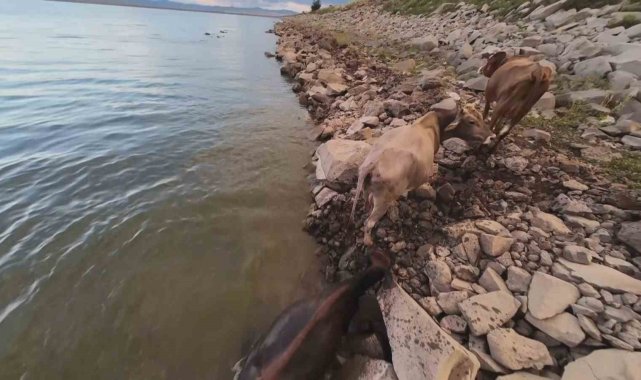 Diyarbakır'da bulunan Devegeçidi Barajı, hayvanların serinleme alanı haline geldi. Büyükbaş hayvanlar baraj göletinde serinlerken, küçükbaş hayvanlar da kendilerini görüntüleyen drondan korkup panikle kaçtı.