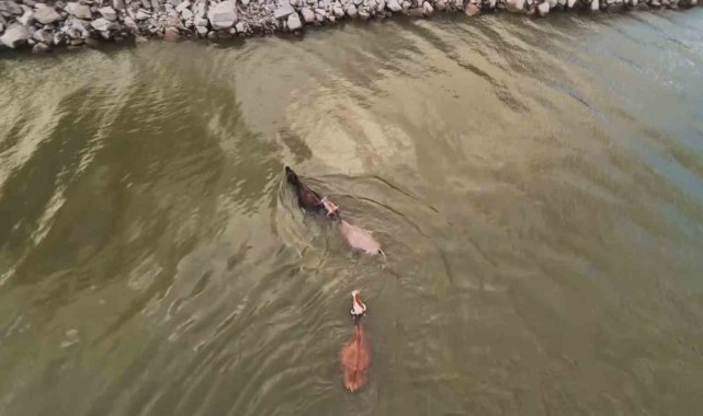 Diyarbakır Devegeçidi Barajında kaydedilen görüntüler izleyenleri hem şaşırttı hem gülümsetti. Sıcak havadan bunalan üç büyükbaş hayvanın baraj göletinde serinlediği anlar, dron kamerasına yansıdı. Aynı bölgede otlayan koyun sürüsü de deponun sesi ve hareketinden ürkerek panikle kaçmaya başladı. Koyunların telaşla dağılması renkli ve ilginç görüntüler ortaya çıkardı.