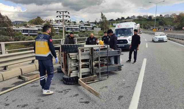 Kaza, saat 15.00 sıralarında Süleyman Demirel Bulvarı'nda meydana geldi. Edinilen bilgiye göre, inşaat malzemesi satan bir iş yerinde çalışan Adem G.'nin kullandığı boş forklift, yolda ilerlediği sırada sürücüsünün direksiyon hakimiyetini kaybetmesi sonucu devrildi. Forkliftin altında kalan işçi, vücudunun çeşitli yerlerinden yaralandı. Çevredekilerin ihbarıyla kaza yerine polis ve sağlık ekipleri sevk edildi. Forkliftin altından çıkarılan Adem G. ambulansla Kuşadası Devlet Hastanesi'ne kaldırıldı. Tedaviye alınan işçinin hayati tehlikesinin bulunmadığı öğrenildi.