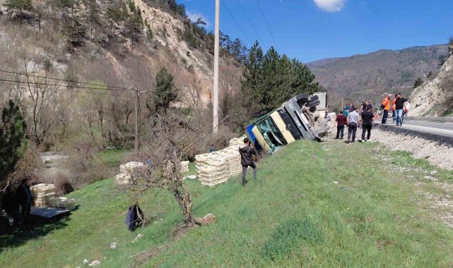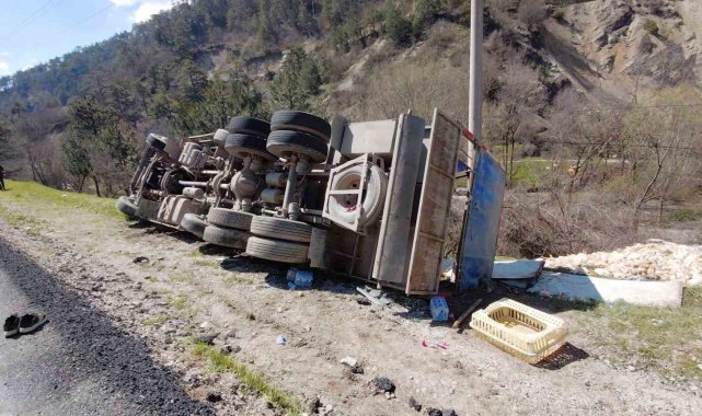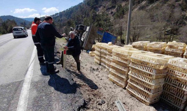 Bolu'nun Mudurnu ilçesinde canlı tavuk yüklü kamyon virajı alamayarak devrildi. Sürücünün yara almadan atlattığı kazada, araç kasasındaki onlarca tavuk telef oldu.