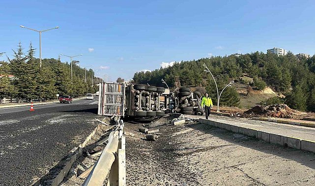 Uşak'ta meydana gelen kazada kontrolden çıkan kömür yüklü tır devrildi, sürücüsü ise yaralandı.