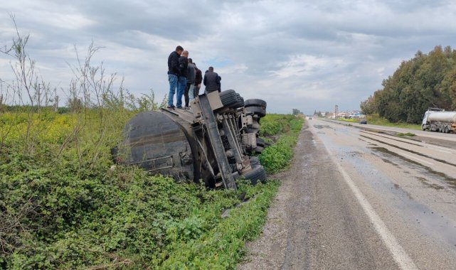 Kaza; Erzin ilçesi E-5 karayolu Yeşiltepe mevkiinde yaşandı. Akaryakıt yüklü Salih Karayay idaresindeki 33 DT 957 tanker, etkili olan yağışla birlikte kayganlaşan yolda kontrolden çıkarak portakal bahçesine devrildi. Devrilme esnasında tankerde bulunan akaryakıt portakal bahçesine aktı ve ağaçlara zarar verdi. Hafif yaralı tanker sürücüsü Karatay ambulansla Erzin Devlet Hastanesine götürüldü. Devrilen tanker vinçle olduğu yerden kaldırıldı.