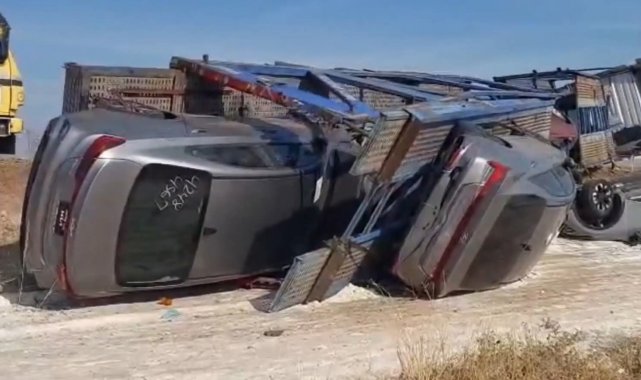 Şanlıurfa'nın Viranşehir ilçesinde sıfır otomobillerin yüklü olduğu bir tırın devrilmesi sonucu milyonluk araçlar büyük hasar gördü.