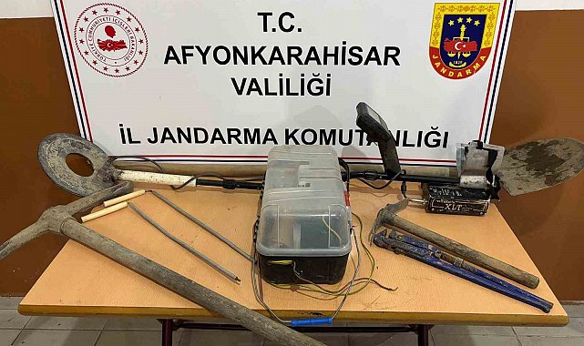 Olay, Sinanpaşa ilçesi Gezler köyünde meydana geldi. Edinilen bilgilere göre, bölgede devriye gezen jandarma ekipleri arazide kaçak kazı yapıldığını tespit etti. Ardından kazı alanına baskın düzenleyen ekipler Y.İ. ve İ.K., isimli şahısları gözaltına aldı. Baskın yapılan alanda yapılan aramada ise dedektör, kazma, kürek, çapa, su bulma cihazı, boru anahtarı ve bakır çubuk ele geçirildi.