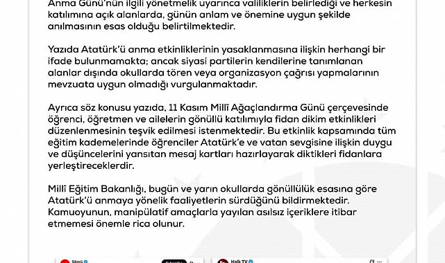 "Çeşitli basın organlarında ve sosyal medya mecralarında, "Milli Eğitim Bakanlığı'nın 10 Kasım'da okullarda Atatürk'ü anmayı yasakladığı ve 'kapıları kilitleyin' talimatı verdiği' şeklinde yer alan iddialar dezenformasyon içermektedir. Milli Eğitim Bakanlığı'nın 8 Kasım tarihli yazısında, 10 Kasım Atatürk'ü Anma Günü'nün ilgili yönetmelik uyarınca valiliklerin belirlediği ve herkesin katılımına açık alanlarda, günün anlam ve önemine uygun şekilde anılmasının esas olduğu belirtilmektedir. Yazıda Atatürk'ü anma etkinliklerinin yasaklanmasına ilişkin herhangi bir ifade bulunmamakta; ancak siyasi partilerin kendilerine tanımlanan alanlar dışında okullarda tören veya organizasyon çağrısı yapmalarının mevzuata uygun olmadığı vurgulanmaktadır. Ayrıca söz konusu yazıda, 11 Kasım Milli Ağaçlandırma Günü çerçevesinde öğrenci, öğretmen ve ailelerin gönüllü katılımıyla fidan dikim etkinlikleri düzenlenmesinin teşvik edilmesi istenmektedir. Bu etkinlik kapsamında tüm eğitim kademelerinde öğrenciler Atatürk'e ve vatan sevgisine ilişkin duygu ve düşüncelerini yansıtan mesaj kartları hazırlayarak diktikleri fidanlara yerleştireceklerdir. Milli Eğitim Bakanlığı, bugün ve yarın okullarda gönüllülük esasına göre Atatürk'ü anmaya yönelik faaliyetlerin sürdüğünü bildirmektedir. Kamuoyunun, manipülatif amaçlarla yayılan asılsız içeriklere itibar etmemesi önemle rica olunur."