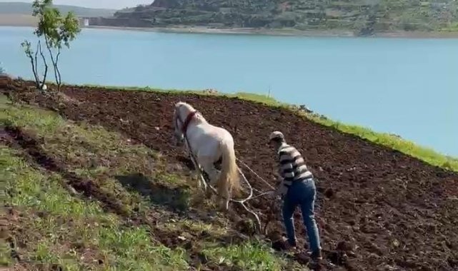 Diyarbakır'ın Dicle ilçesinde çiftçinin atla tarlasını sürdüğü anlar objektiflere yansıdı.