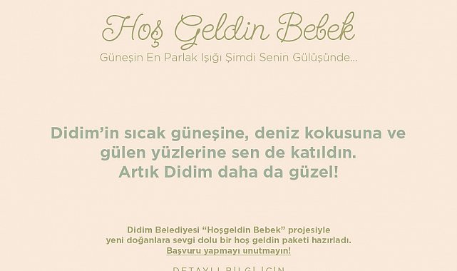 'Hoş Geldin Bebek' projesine başvuruda bulunmak için Didim Belediyesi Halk Masası ile iletişime geçerek başvuruda bulunabiliyor.