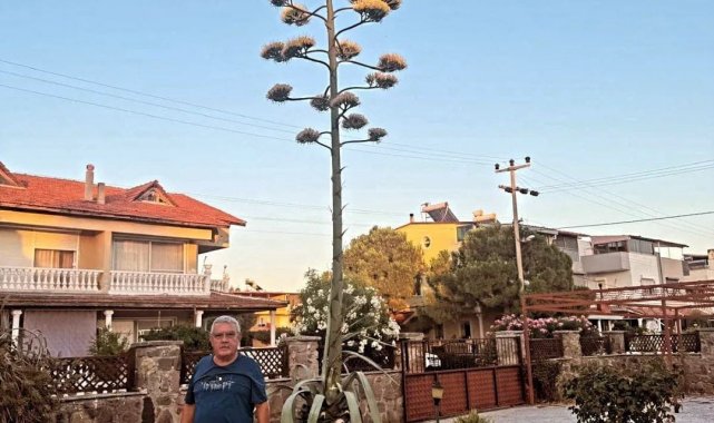 Dikili'de yaklaşık 30 yıl önce toprakla buluşan agave bitkisi, çiçek açmış görüntüsüyle bölgeden geçen vatandaşların ilgi odağı haline geldi. Bitkinin önünde durup hatıra fotoğrafı çekenler, bu nadir ana tanıklık etmenin heyecanını yaşıyor.