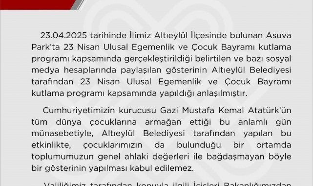 Balıkesir Valiliği kamuoyuna yapmış olduğu açıklama şu şekilde: "23.04.2025 tarihinde ilimiz Altıeylül ilçesinde bulunan Asuva Park'ta 23 Nisan Ulusal Egemenlik ve Çocuk Bayramı kutlama programı kapsamında gerçekleştirildiği belirtilen ve bazı sosyal medya hesaplarında paylaşılan gösterinin Altıeylül Belediyesi tarafından 23 Nisan Ulusal Egemenlik ve Çocuk Bayramı kutlama programı kapsamında yapıldığı anlaşılmıştır. Cumhuriyetimizin kurucusu Gazi Mustafa Kemal Atatürk'ün tüm dünya çocuklarına armağan ettiği bu anlamlı gün münasebetiyle, Altıeylül Belediyesi tarafından yapılan bu etkinlikte, çocuklarımızın da bulunduğu bir ortamda toplumumuzun genel ahlaki