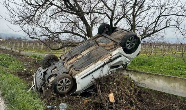 Bursa'nın İznik ilçesinde yağışlı hava sebebiyle aracın direksiyon hakimiyetini kaybeden sürücü takla attı.