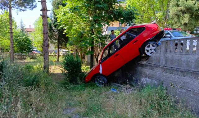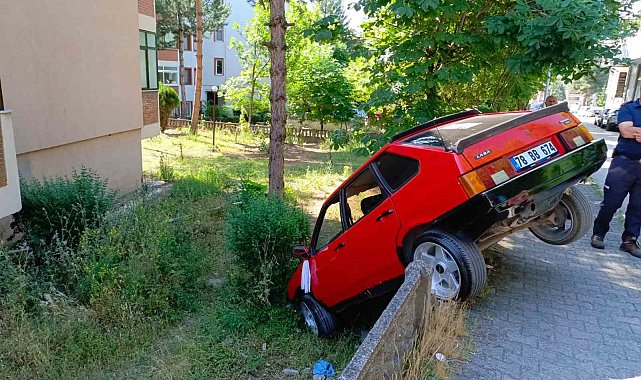 Karabük'ün Safranbolu ilçesinde iddiaya göre direksiyonu kilitlenen otomobil kontrolden çıkarak bir apartmanın bahçesine düştü.