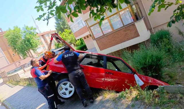 Direksiyonu kilitlenen otomobil apartman bahçesine düştü