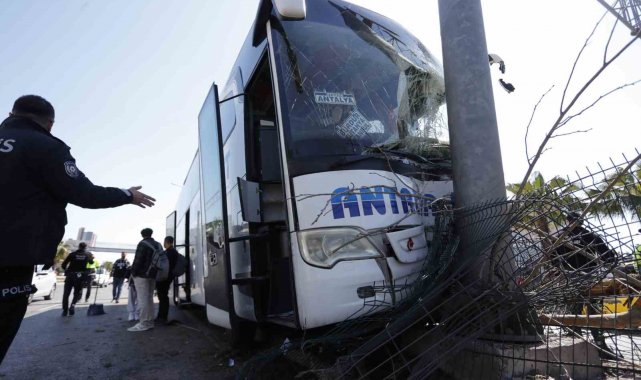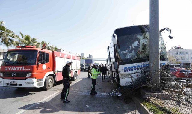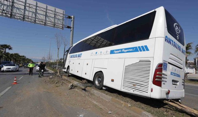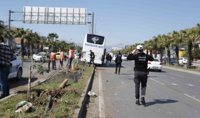 Antalya'da direksiyonu kilitlenen ve yaklaşık 50 metre ağaçları yıkarak refüjde ilerleyen otobüs yol tabelasına çarparak durabildi. Kazada direksiyon başında sıkışan ve itfaiye ekip bulunduğu yerden çıkartılan sürücü yaralandı.