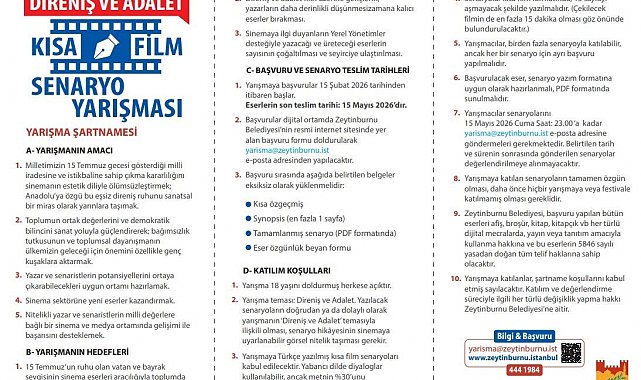 Zeytinburnu Belediyesi tarafından düzenlenen "Direniş ve Adalet" temalı Kısa Film Senaryo Yarışması için geri sayım başladı. Genç senaristlere önemli fırsatlar sunan yarışmada son başvuru tarihi 15 Mayıs olarak açıklandı. 15 Temmuz'un 10'uncu yılına doğru ilerlenirken hayata geçirilen yarışma, toplumsal hafızayı sanatın estetik diliyle geleceğe taşımayı amaçlıyor. Katılımcılardan direniş ve adalet kavramlarını yalnızca tarihsel bir çerçevede değil, evrensel, insani ve vicdani boyutlarıyla ele alan özgün hikayeler geliştirmeleri bekleniyor.