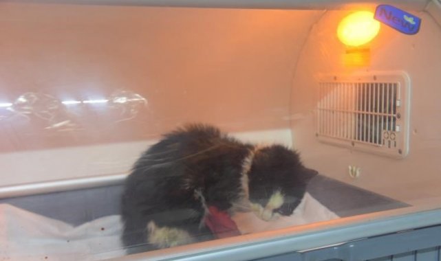 Bilecik'te duyarlı bir vatandaş tarafından sol ön patisine basamadığı için sağlık ekiplerine getirilen ve distal oblik kırığı tespit edilen sokak kedi, 2 saatlik operasyon sonrası sağlığına kavuştu