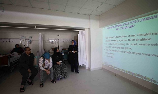 Toplantıda hastalara bilgiler veren Doç. Dr. Kader UĞUR, Diyabetin kan şekeri yüksekliğinin ortaya çıkmasıyla birlikte vücutta başlıca kalp, beyin, böbrek, sinir ve damarları etkileyen, kontrolsüz kalındığında körlük, kalp krizi, felç, böbrek yetmezliğine bağlı diyaliz ve diyabetik ayak yaralarına neden olabilen sistemik bir metabolizma hastalığı olduğunu söyledi. Do. Dr. Uğur, diyabet hastalığının kalp damar hastalıklarıyla eşdeğer bir hastalık olduğunu ifade ederek kan şekerinin kontrol altında tutulmasının çok önemli olduğunu, tedavinin temelini hastaların eğitiminin oluşturduğunu, diyabetin multidisipliner bir tedavi gerektirdiğini, tedavi için ilk sırada yaşam tarzı değişikliğinin geldiğini, bunu kişiye özel sağlıklı beslenme ve düzenli yapılacak egzersizlerin oluşturduğunu kaydetti. Doç. Dr. Uğur hastalara medikal tedavi olarak başlıca ağızdan alınan anti diyabetik ilaçlar ve insülin kullanıldığını, düzenli uyku ve günlük hayatta stresle baş etmeyi öğrenmek tedavinin diğer önemli bir parçası olduğunu, bu açıdan hastaların farkındalığını artırmak, onları hastalıkları hakkında bilgilendirmek ve empati kurarak sorularını cevaplayabilmek için düzenli aralıklarla eğitim toplantıları düzenlediklerini sözlerine ekledi.