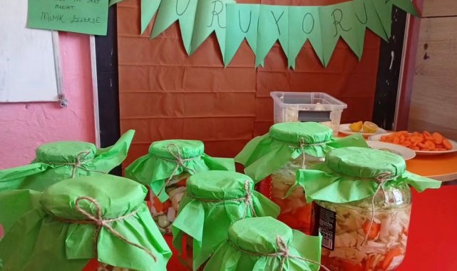Renkli görüntülere sahne olan etkinlikte minik öğrenciler, öğretmenleri eşliğinde turşu yapımının aşamalarını uygulamalı olarak öğrendi.