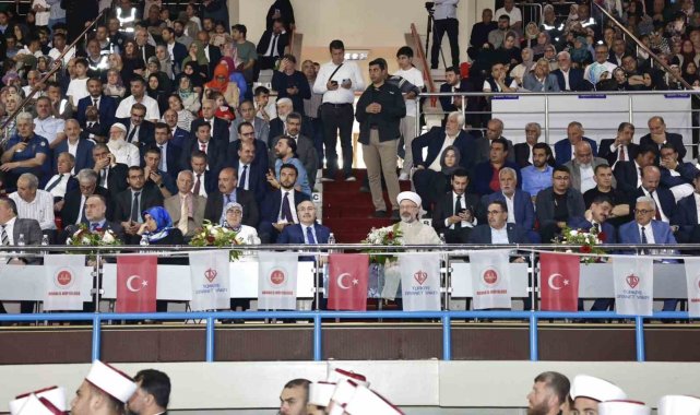 Burada konuşan Diyanet İşleri Başkanı Ali Erbaş, "En hayırlıların bulunduğu mekandayız. Kur'an'ı öğrenenler, öğretenler ve hafızlarımız burada. Farkında mısınız? Şuan da melekler yukarıda kanatlarını germişler, bizim için sağanak sağanak rahmet yağdırıyorlar. Hayırlı uğurlu olsun. Mücadelemizi Kur'an'ın yolunda yapıyoruz. Resulullah'ın yolunda mücadelemizi veriyoruz. Çünkü Resulullah'ın bize müjdesi, emaneti, vasiyeti var. O'nun vasiyetini yerine getiriyoruz. Peygamber Efendimiz Veda Hutbesi'nde 'Size iki şeyi emanet bıraktım. Bu iki şeye sarıldığınız sürece yolunuzu şaşırmazsınız. Bunlardan birisi Allah'ın kitabı diğeri de Resul'ünün sünneti' buyuruyor. İşte Ya Resulullah, senin ümmetin olarak bu vasiyetine uyuyoruz, vasiyetini yerine getirmeye çalışıyoruz. İşte burada ümmetinin bir bölümü. 500'e yakın ümmetinin gençleri senin vasiyetini yerine getirdi" ifadelerini kullandı.