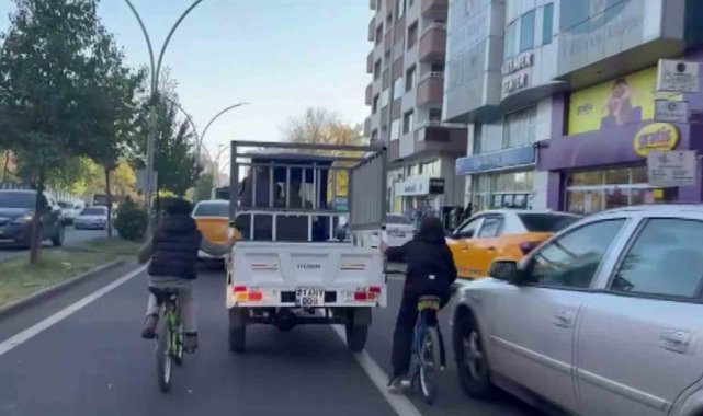 Diyarbakır'da bisikletli iki çocuk, canlarını tehlikeye atarak sepetli motora tutunup ilerledi. Çocuklardan biri başka bir aracın altında kalmaktan son anda kurtuldu.
