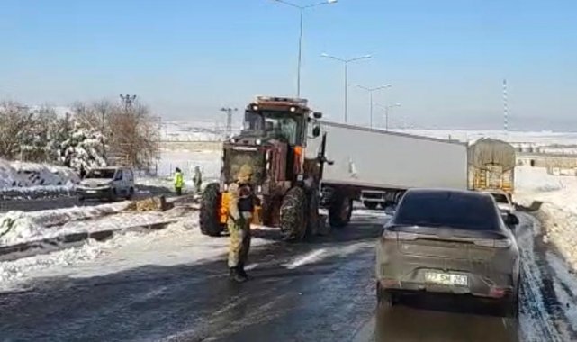 Diyarbakır'da kar yağışı sonrası oluşan buzlanma nedeniyle sürücüsünün direksiyon hakimiyetini kaybettiği tır yoldan çıktı.