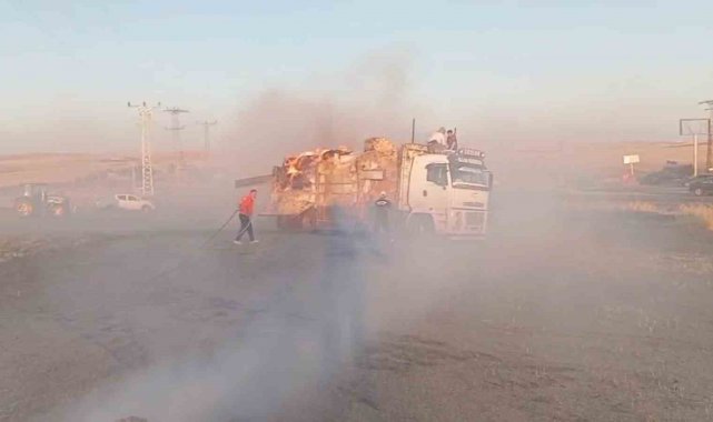 Diyarbakır'ın Silvan ilçesinde kamyonda alev alan saman balyaları vatandaşlar ve itfaiye ekiplerinin müdahalesiyle söndürüldü.