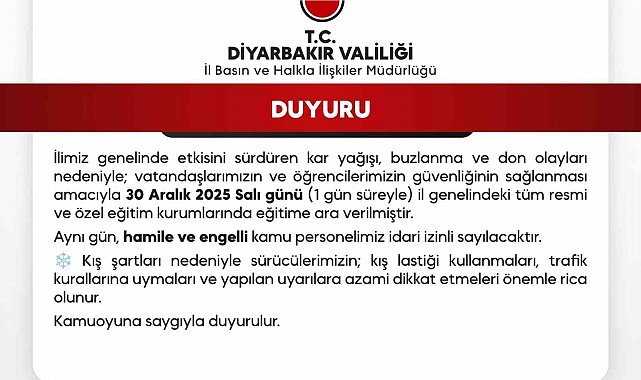 Diyarbakır Valiliğinden yapılan açıklamada, "İlimiz genelinde etkisini sürdüren kar yağışı, buzlanma ve don olayları nedeniyle; vatandaşlarımızın ve öğrencilerimizin güvenliğinin sağlanması amacıyla 30 Aralık 2025 Salı günü 1 gün süreyle il genelindeki tüm resmi ve özel eğitim kurumlarında eğitime ara verilmiştir. Aynı gün, hamile ve engelli kamu personelimiz idari izinli sayılacaktır" denildi.