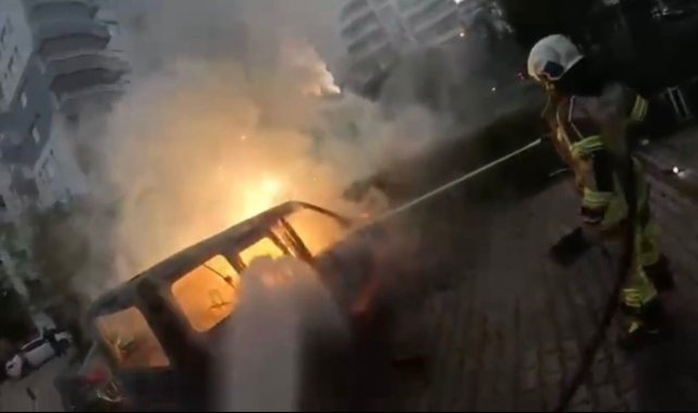 Öte yandan, aracın yanma anı kısa sürede olay yerine intikal eden itfaiye erlerinin kask kameralarına yansıdı. Görüntülerde, araçtan hızla inen itfaiye erlerinin yanan araca ve alevlerin sıçradığı diğer araca müdahale ederek yangını kısa sürede kontrol altına aldığı görülüyor.