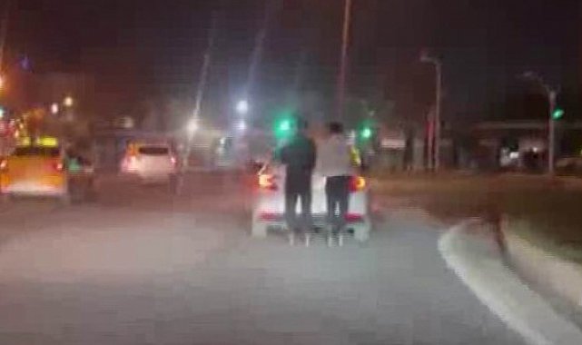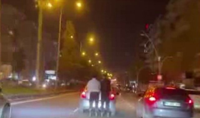 Diyarbakır-Şanlıurfa yolunda patenli iki genç bir otomobilin arkasına tutunarak ilerledi. Hem canlarını hem de trafiği tehlikeye atan gençlerin tehlikeli yolculuğu cep telefonu kamerasına anbean yansıdı.
