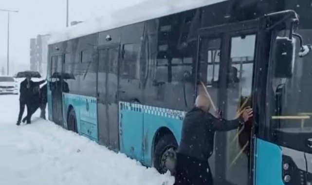 Kar nedeniyle ilerleyemeyen otobüslerdeki yolcular ve çevrede bulunan vatandaşlar araçlardan inerek otobüsleri itip yollarına devam etmelerini sağladı. O anlar cep telefonu kameralarına yansıdı.