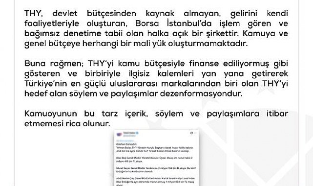DMM'nin sosyal medya hesabından yapılan paylaşımda, "Bazı açıklamalarda ve sosyal medya paylaşımlarında ülkemizin bayrak taşıyıcı hava yolu olan Türk Hava Yolları'na ilişkin ortaya atılan iddialar dezenformasyon içermektedir. THY, devlet bütçesinden kaynak almayan, gelirini kendi faaliyetleriyle oluşturan, Borsa İstanbul'da işlem gören ve bağımsız denetime tabii olan halka açık bir şirkettir. Kamuya ve genel bütçeye herhangi bir mali yük oluşturmamaktadır. Buna rağmen; THY'yi kamu bütçesiyle finanse ediliyormuş gibi gösteren ve birbiriyle ilgisiz kalemleri yan yana getirerek Türkiye'nin en güçlü uluslararası markalarından biri olan THY'yi hedef alan söylem ve paylaşımlar dezenformasyondur. Kamuoyunun bu tarz içerik, söylem ve paylaşımlara itibar etmemesi rica olunur" ifadelerine yer verildi.