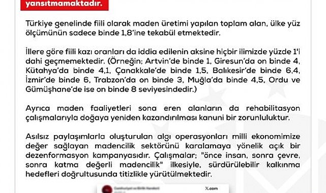 Dezenformasyonla Mücadele Merkezi'nin sosyal medya hesabından yapılan paylaşımda, "Bazı sosyal medya mecralarında ve çeşitli yayın organlarında yer alan ülkemizin farklı illerindeki arazi varlığının büyük bir kısmının 'maden sahası olarak ruhsatlandırıldığı' yönündeki iddialar gerçeği yansıtmamaktadır. Türkiye genelinde fiili olarak maden üretimi yapılan toplam alan, ülke yüzölçümünün sadece binde 1,8'ine tekabül etmektedir. İllere göre fiili kazı oranları da iddia edilenin aksine hiçbir ilimizde yüzde 1'i dahi geçmemektedir. (Örneğin Artvin'de binde 1, Giresun'da on binde 4, Kütahya'da binde 4,1, Çanakkale'de binde 1,5, Balıkesir'de binde 6,4, İzmir'de binde 6, Trabzon'da on binde 3, Muğla'da binde 4,5, Ordu ve Gümüşhane'de ise on binde 8 seviyesindedir)" denildi.