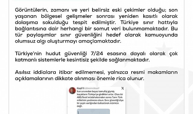 Merkezin sosyal medya hesabından yaptığı açıklamada, görüntülerin eski olduğu belirtilerek, "Bazı sosyal medya hesaplarında, İran sınırından Türkiye'ye kaçak giriş yapıldığı iddiasıyla paylaşılan görüntüler dezenformasyon içermektedir. Görüntülerin, zamanı ve yeri belirsiz eski çekimler olduğu; son yaşanan bölgesel gelişmeler sonrası yeniden kasıtlı olarak dolaşıma sokulduğu tespit edilmiştir. Türkiye sınır hattıyla bağlantısına dair herhangi bir somut veri bulunmamaktadır. Bu tür paylaşımlar sınır güvenliğini hedef alarak kamuoyunda olumsuz algı oluşturmayı amaçlamaktadır. Türkiye'nin hudut güvenliği 7 gün 24 saat esasına dayalı olarak çok katmanlı sistemlerle kesintisiz şekilde sağlanmaktadır. Asılsız iddialara itibar edilmemesi, yalnızca resmi makamların açıklamalarının dikkate alınması önemle rica olunur" açıklamasında bulunuldu.