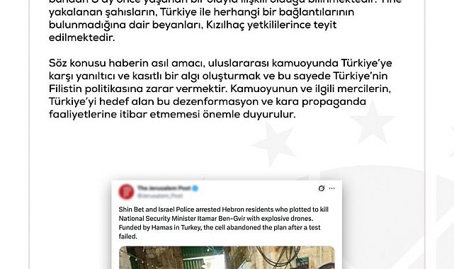 DMM'nin sosyal medya hesabından yapılan açıklamada, "İsrail'de bazı medya kuruluşlarında yer alan, İsrailli bir bakana yönelik suikast planı haberinde ülkemizin adının geçmesi, Türkiye'ye karşı yürütülen maksatlı bir dezenformasyon faaliyetinin ürünüdür. İsrail basınına yeni bir gelişme olarak servis edilen konunun aslında bundan 8 ay önce yaşanan bir olayla ilişkili olduğu bilinmektedir. Yine yakalanan şahısların, Türkiye ile herhangi bir bağlantılarının bulunmadığına dair beyanları, Kızılhaç yetkililerince teyit edilmektedir. Söz konusu haberin asıl amacı, uluslararası kamuoyunda Türkiye'ye karşı yanıltıcı ve kasıtlı bir algı oluşturmak ve bu sayede Türkiye'nin Filistin politikasına zarar vermektir. Kamuoyunun ve ilgili mercilerin, Türkiye'yi hedef alan bu dezenformasyon ve kara propaganda faaliyetlerine itibar etmemesi önemle duyurulur" ifadelerine yer verildi.
