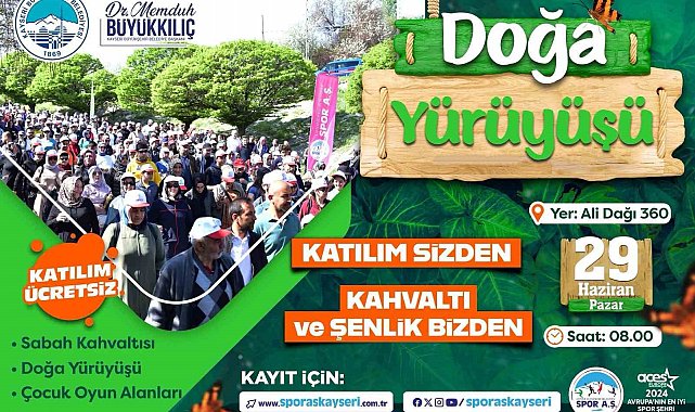 Hayata geçirdiği proje ve gerçekleştirdiği yatırımlarla Avrupa Spor Şehri seçilen Kayseri'ye Altın Bayrak kazandıran Başkan Dr. Memduh Büyükkılıç yönetimindeki Kayseri Büyükşehir Belediyesi, insanı merkezine alan faaliyetlere imza atmayı sürdürüyor. Sporun ve sporcunu dostu Büyükşehir Belediyesi, bu kez de vatandaşları keyif dolu bir aktiviteye çağırıyor. Ali Dağı 360'tan 29 Haziran Pazar günü saat 08.00'de başlayacak katılımın ücretsiz olduğu doğa yürüyüşü, sporu, eğlenceyi ve sosyal etkinliği bir arada sunacak. Sabahın ilk ışıkları ile başlayacak coşku dolu etkinlikte, sabah kahvaltısı, doğa yürüyüşü ve çocuk oyun alanları yer alacak. Katılımın vatandaşlardan, kahvaltı ve şenliğin Büyükşehir Belediyesi'nden olacağı doğa yürüyüşüne kayıtlar yalnızca online olarak yapılırken, kayıt için www.sporaskayseri.com.tr adresli web sitesi ziyaret edilecek.