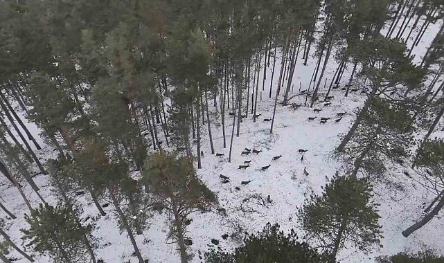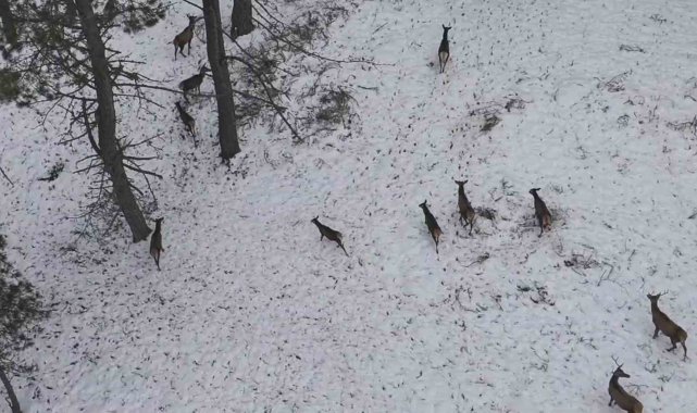 Samsun'da görev yapan Genel Cerrahi Uzmanı Doç. Dr. İlhan Karabıçak, doğada gezdiği sırada rast geldiği kızılgeyik sürüsünü dron ile görüntüledi. Geyiklerin karlı ormandaki görüntüsü ise doğanın güzelliğini gözler önüne serdi.