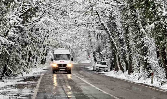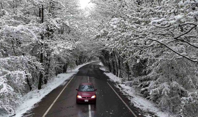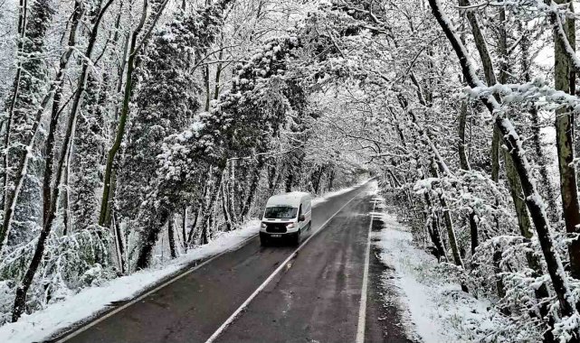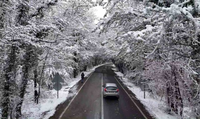 Karabük-Bartın kara yolunda iki yandan uzanan ağaçların dallarının oluşturduğu doğal ağaç tünel karla birlikte beyaz örtüyle kaplandı.