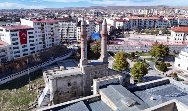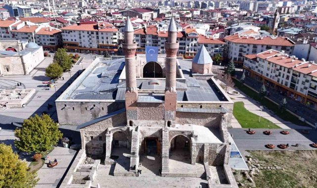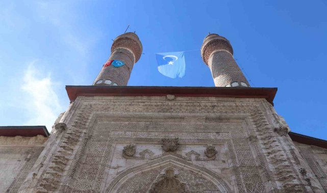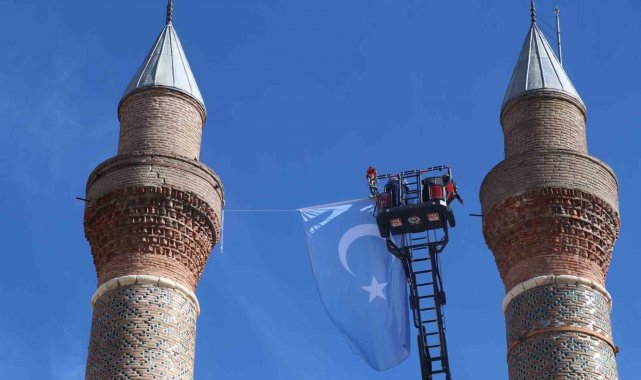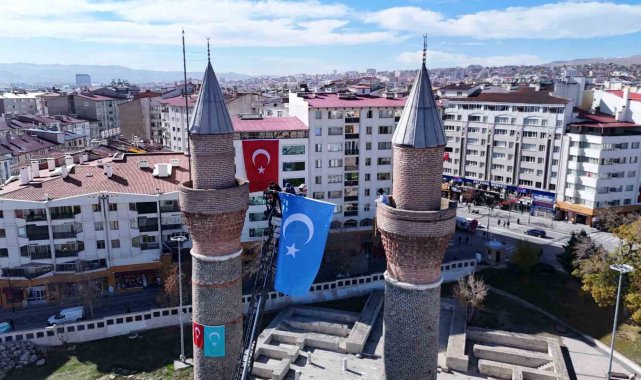 Sivas Cumhuriyet Üniversitesi öğrencileri, Doğu Türkistan'da yaşanan zulme dikkat çekmek ve farkındalık oluşturmak amacıyla tarihi Çifte Minareli Medrese'ye Türk bayrağı ile birlikte Doğu Türkistan bayrağı astı.