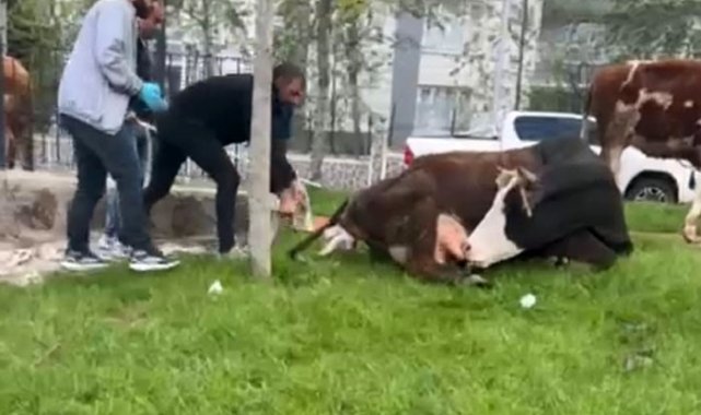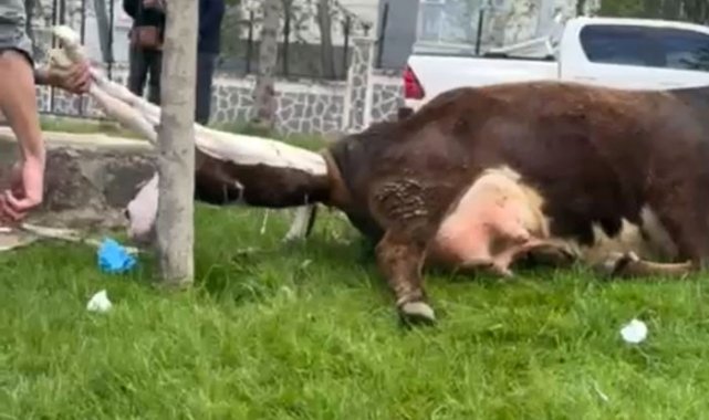 Diyarbakır'da bir parkta otlanan ve doğum sancısı çeken ineği, belediye ekipleri doğurttu.