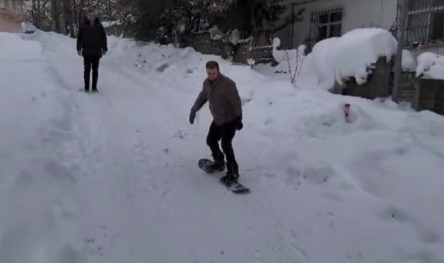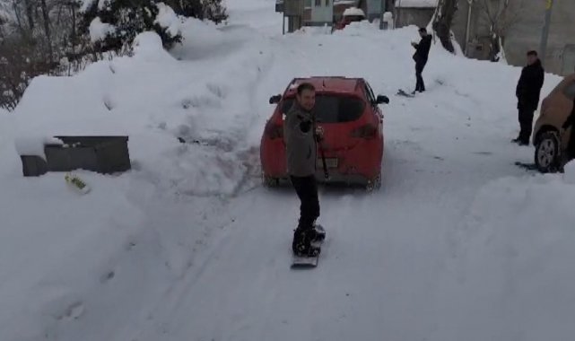 Ordu'nun Çamaş ilçesinde görev yapan doktor, karla kaplanan sokaklarda snowboard yaptı.