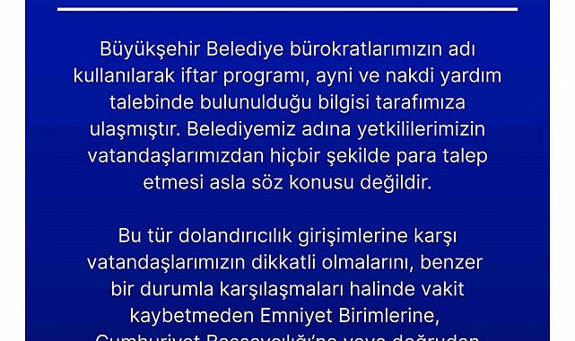 Erzurum Büyükşehir Belediyesi, Ramazan Ayı münasebetiyle vatandaşları uyardı. Uyarıda; bürokratların adı kullanılarak iftar programı, ayni ve nakdi yardım talebinde bulunulduğu ifade edildi ve vatandaşların bunlara itibar etmeyerek güvenlik güçlerine bilgi verilmesi istendi.