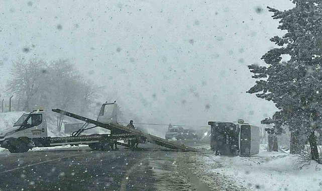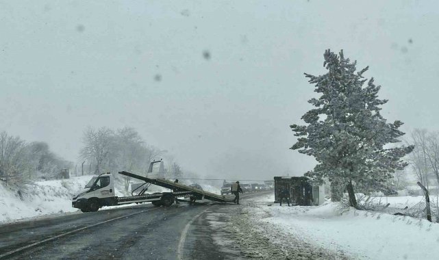 Kar yağışının etkili olduğu Domaniç-İnegöl yolu Kocayayla Orman Deposu yakınlarında bir ticari araç, sürücüsünün kontrolünü kaybetmesi sonucu devrildi. Kazanın ardından olay yerine yönlendirilen ekipler, bölgedeki trafiğin güvenliğini sağladı.