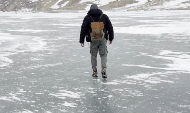 İstanbul'dan Sivas'a giden bir vatandaş, soğuk hava nedeniyle tamamen donan İncesu Barajı'nın üzerine çıktı.