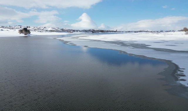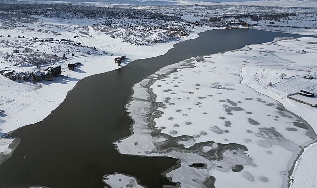 Hava sıcaklıklarının sıfır derecelerin altına düştüğü Afyonkarahisar'da donan Emre Gölü yanı başındaki tarihi eserler ile masalsı görüntüler oluşturdu.