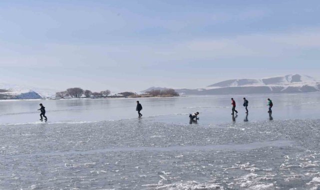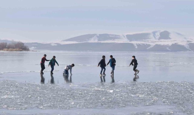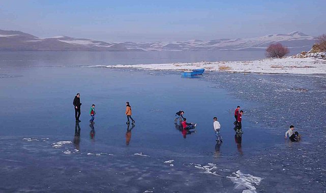 Bitlis'in Ahlat ilçesinde bulunan ve soğuk hava nedeniyle yüzeyi buzla kaplanan Nazik Gölü çocukların oyun alanı oldu.