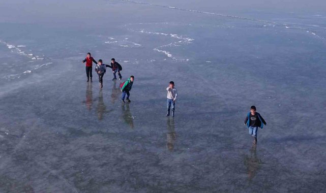 Göle kıyısı bulunan Dilburnu köyündeki çocuklar donan göl üzerinde gün boyu kayıp çeşitli oyunlar oynayarak keyfini çıkarıyor. Çocukların donan göl üzerinde kayıp oynaması havadan dron ile görüntülendi.